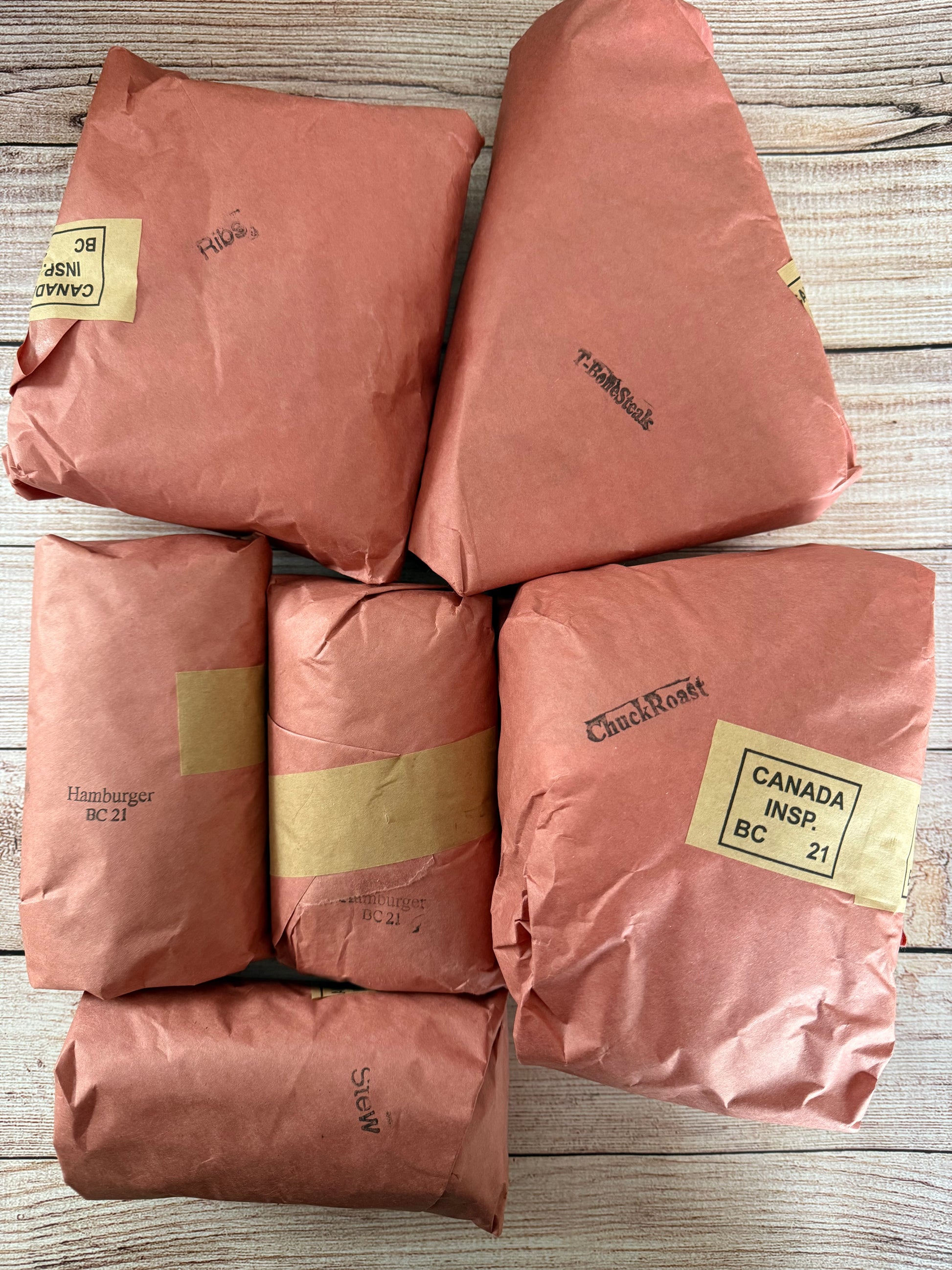 This bag includes 2 lbs of lean ground beef, 1 package of stew meat, 1 package of rib steak or t-bone steak, 1 chuck roast and your choice of a package a ribs or a package of chuck steak.