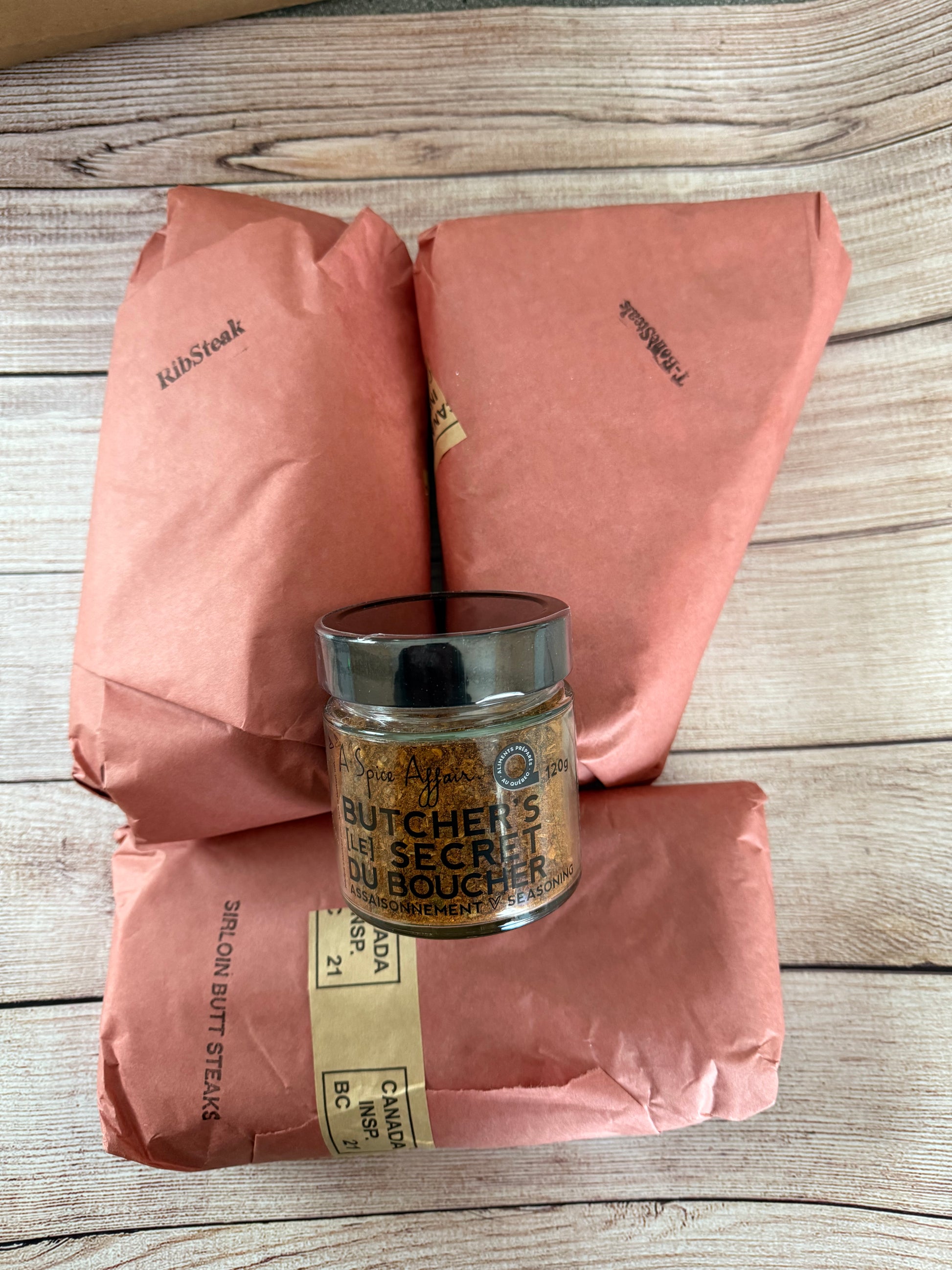 This bag includes 1 package of rib steak, 1 package of t-bone steak, 1 package of sirloin butt steak and 1 Butcher’s Secret Seasoning.