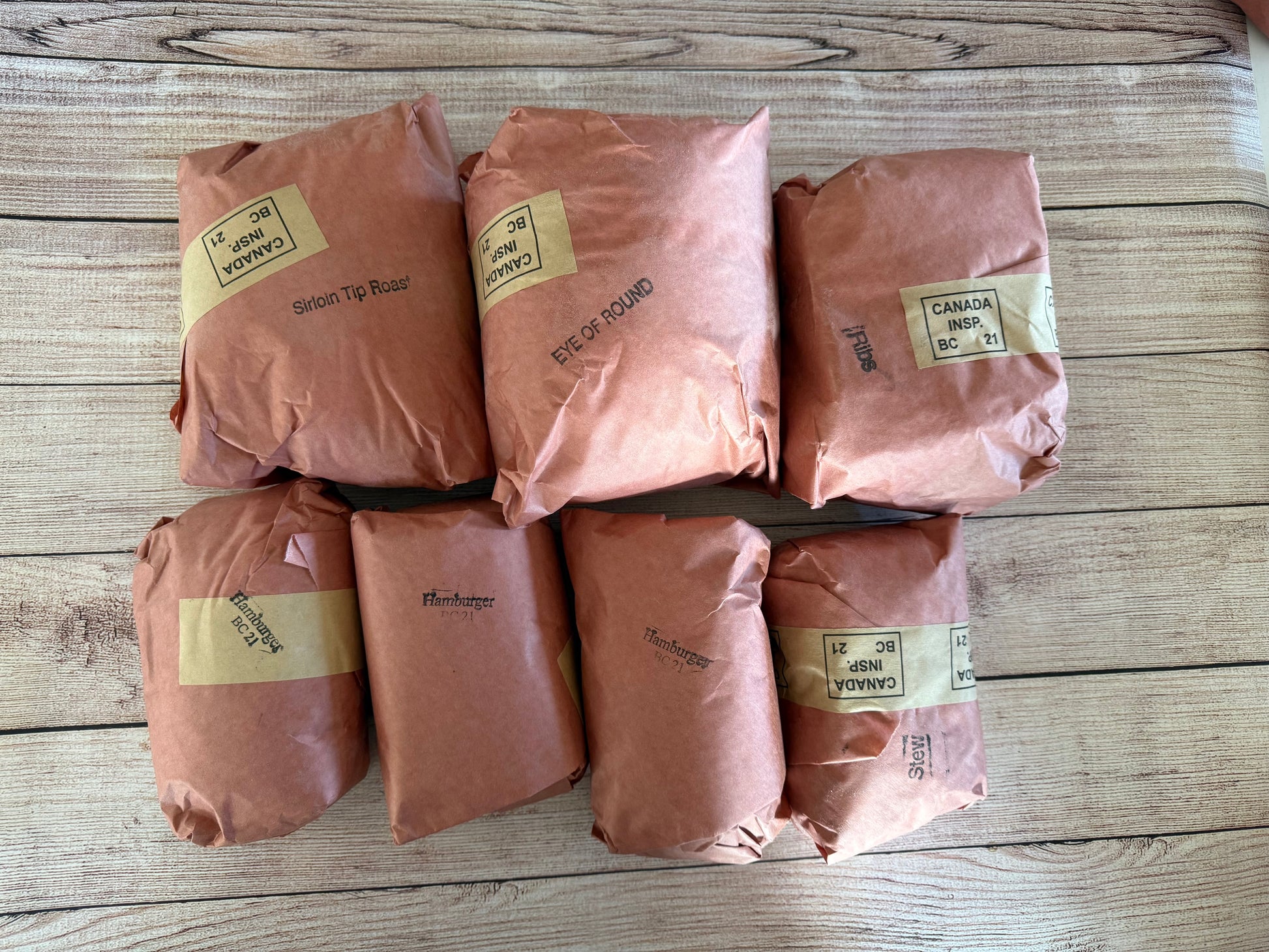 This bag includes 3 lbs of lean ground beef, 1 round roast, 1 sirloin tip roast, 1 package of stew meat, and your choice of a package a ribs or a package of chuck steak.